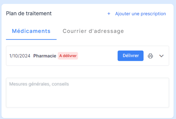 Pour délivrer des médicaments depuis la consultation, cliquez sur le bouton "délivrer" à côté de votre prescription de pharmacie.